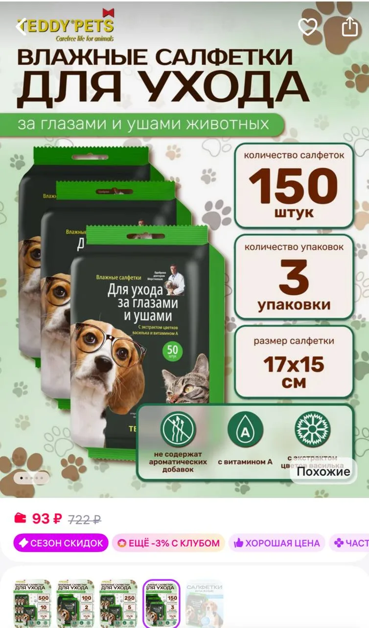 Teddy pets Влажные салфетки для глаз и ушей собак и кошек 150 шт 3 уп 🩷