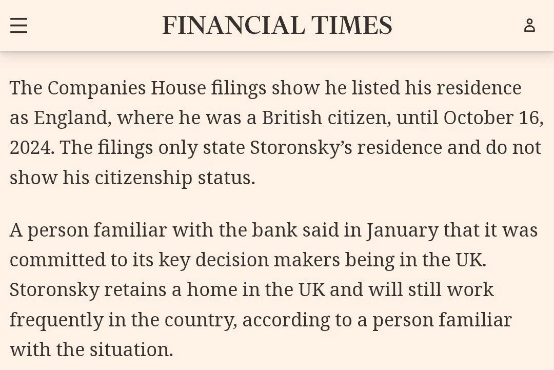 Николай Сторонский уехал из Британии, чтобы не платить миллиарды налогов на прирост акций банка. Его 18% акций банка «Revolut» при возможной оценке компании $200 млрд долларов дадут $36 млрд. Его доход от прироста капитала составит под $10 млрд, и ему нужно будет оплатить налог $2,5 млрд. В ОАЭ налог будет равен нулю, поэтому Сторонский с 2024 года уже не жил в Британии, как и многие другие миллионеры и миллиардеры.