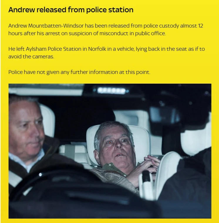 Брат короля Великобритании Эндрю после помпезного задержания вчера, пробыл 12 часов в полиции и был ОТПУЩЕН)))