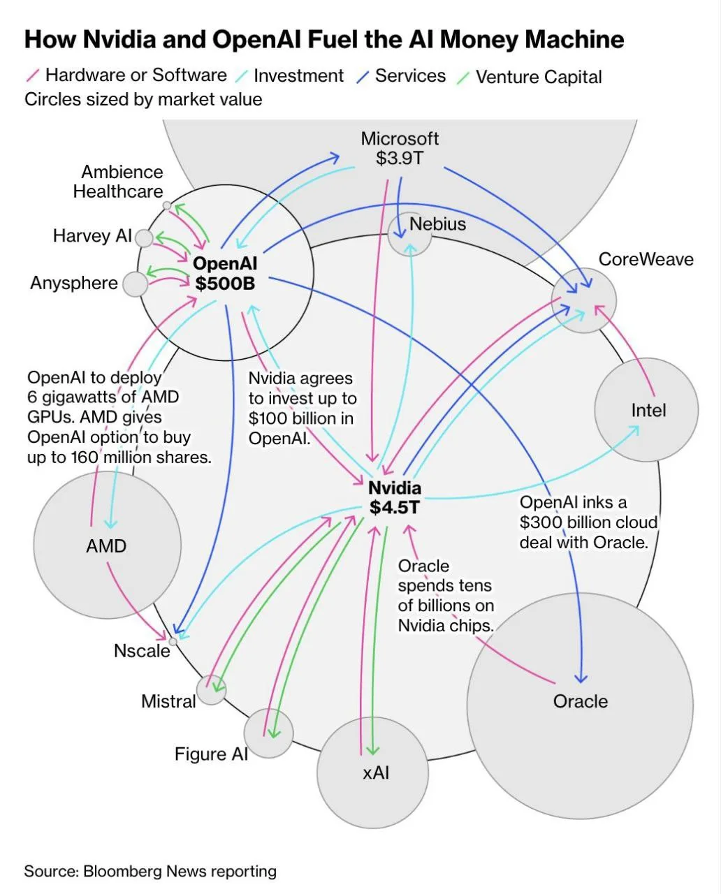 OpenAI и Nvidia раздувают пузырь искусственного интеллекта объёмом в 1 триллион долларов с помощью сети циклических сделок.