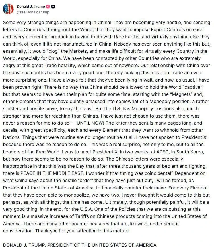 Стоит признать, что Китай достаточно долго не реагировал на хамство Трампа, но после введения ограничений на поставки в Поднебесную микро-чипов для ИИ, введения дополнительных пошлин в американских портах на суда, которые изготовлены на китайских верфях, введение запрета деятельности высокотехнологичных китайских компаний на территории США и попытки ввести подобные ограничения на территории ЕС и Британской империи, терпение Си Цзиньпина лопнуло.