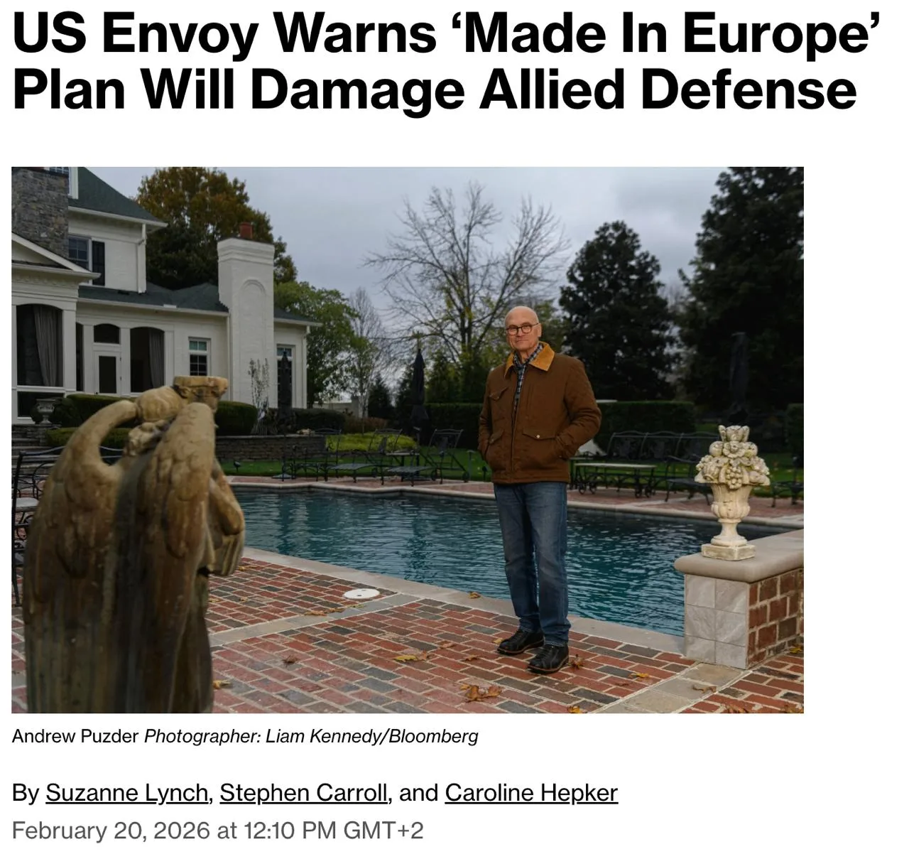Уже аж Постпред США при ЕС рвёт и мечет, заявляя о «серьёзной ошибке», если Евросоюз начнёт закупать больше своего оружия, а не американского.