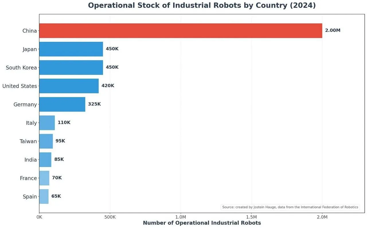 С 2014 по 2024 год количество промышленных роботов в КНР выросло с 200 тыс. до 2 млн, но занятость в обрабатывающей промышленности осталась на том же уровне — около 140 млн человек.
