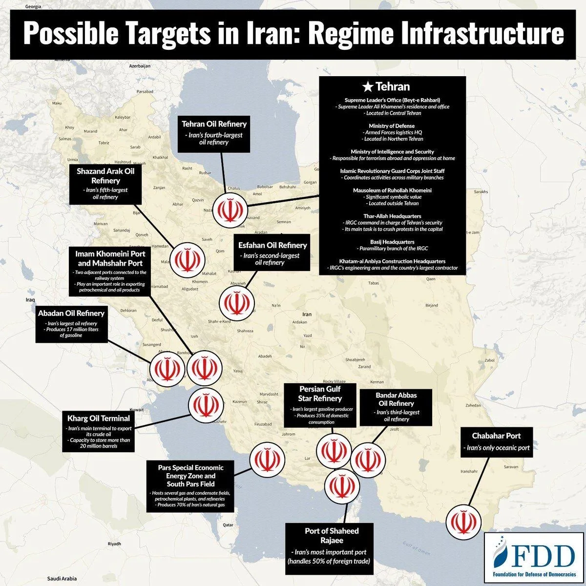 В списке потенциальных целей значатся: НПЗ Абадан, Исфахан, Тегеран, Шазанд Арак, «Звезда залива» (производит примерно 40% всего бензина в Иране), Бендер-Аббас, экспортный терминал на острове Харк, а затем и основные порты, через которые идёт экспорт.