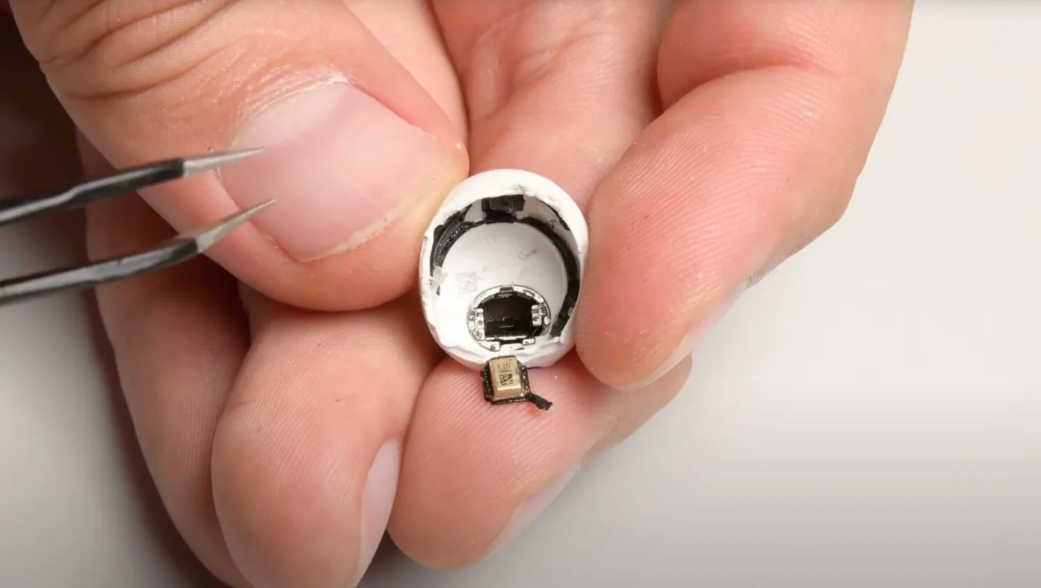 Внутри каждого наушника находится аккумулятор ёмкостью 0,221 Вт•ч. Добраться до батареи крайне сложно, и даже не каждый СЦ за это возьмётся, — отметили в iFixit. Сначала необходимо нагреть корпус, затем прорезать себе путь внутрь и кропотливо отделять клеевую основу от мелких кабелей.