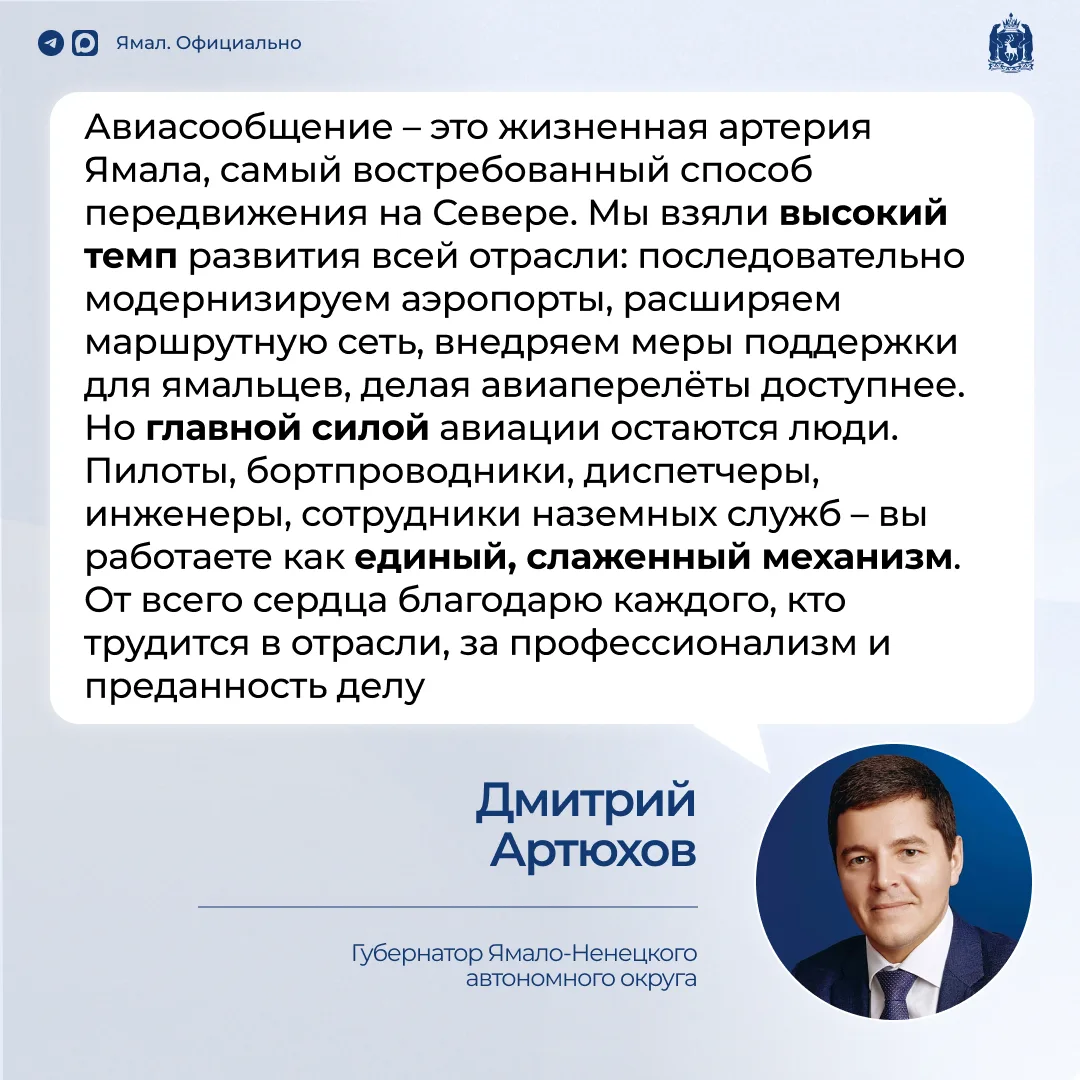 В авиации Ямала сегодня трудятся более пяти тысяч человек. С праздником работников и ветеранов отрасли поздравил губернатор Дмитрий Артюхов.