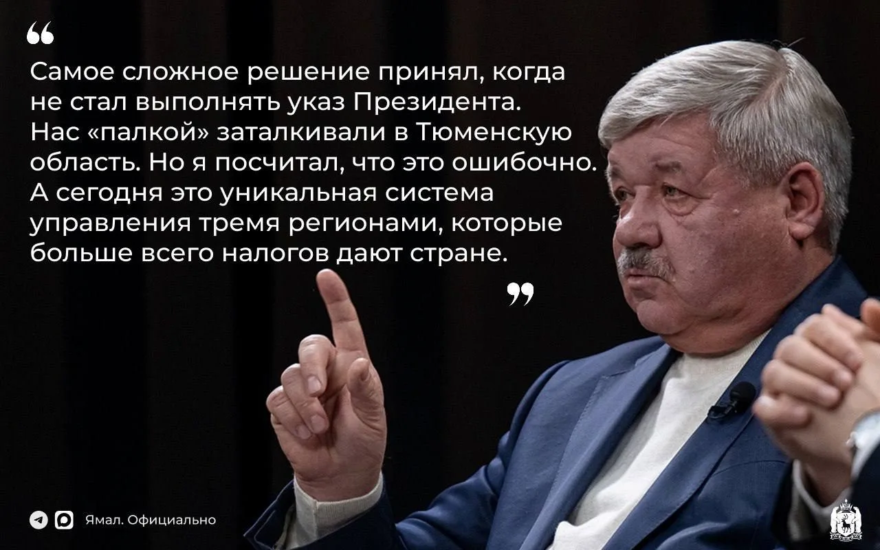 В юбилей округа вышло эксклюзивное интервью «Ямал.Три главы одной истории». В одной студии о руководстве регионом в разные периоды рассказали бывшие и действующий губернаторы. Юрий Неёлов, Дмитрий Кобылкин и Дмитрий Артюхов — пример настоящей преемственности. Они обсуждают, как передавалась эстафета реализации масштабных проектов и как хорошие личные отношения помогали и помогают в решении государственных задач.