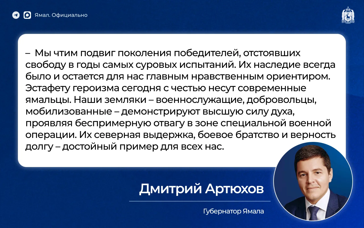 — Наша Конституция – фундамент суверенитета. Она закрепляет те ценности, которые делают нас сильным народом: историческую правду, приоритет семьи, любовь к Родине и ответственность за её судьбу. В ней гарантия того, что наши национальные интересы и безопасность всегда будут на первом месте. Для нас, северян, любовь к стране всегда выражается в конкретных делах. Ямал – энергетическое сердце России, её надежный тыл и опора. Своим трудом мы укрепляем экономическую мощь державы, развиваем Арктику, создаём условия для будущих поколений, — отметил Дмитрий Артюхов.