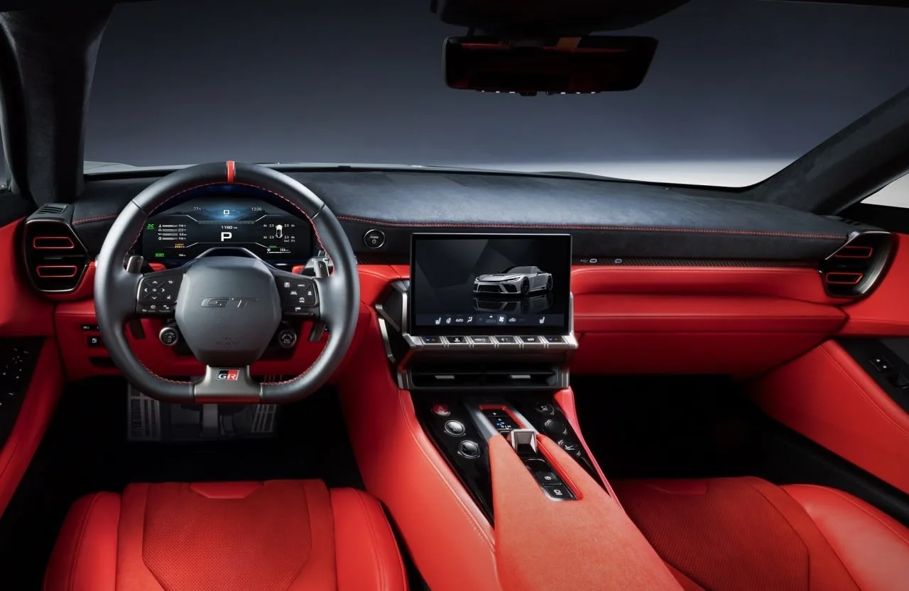 Салон отделан кожей, алькантарой и карбоном, оснащен ковшеобразными креслами и двумя экранами. Также продемонстрирован гоночный вариант GR GT3.