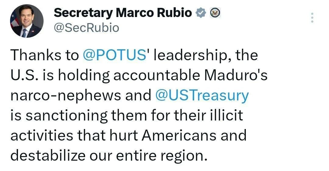 Благодаря руководству Дональда Трампа, США привлекают к ответственности нарко-племянников Мадуро, и Министерство финансов США вводит против них санкции за их незаконную деятельность, которая вредит американцам и дестабилизирует весь наш регион,