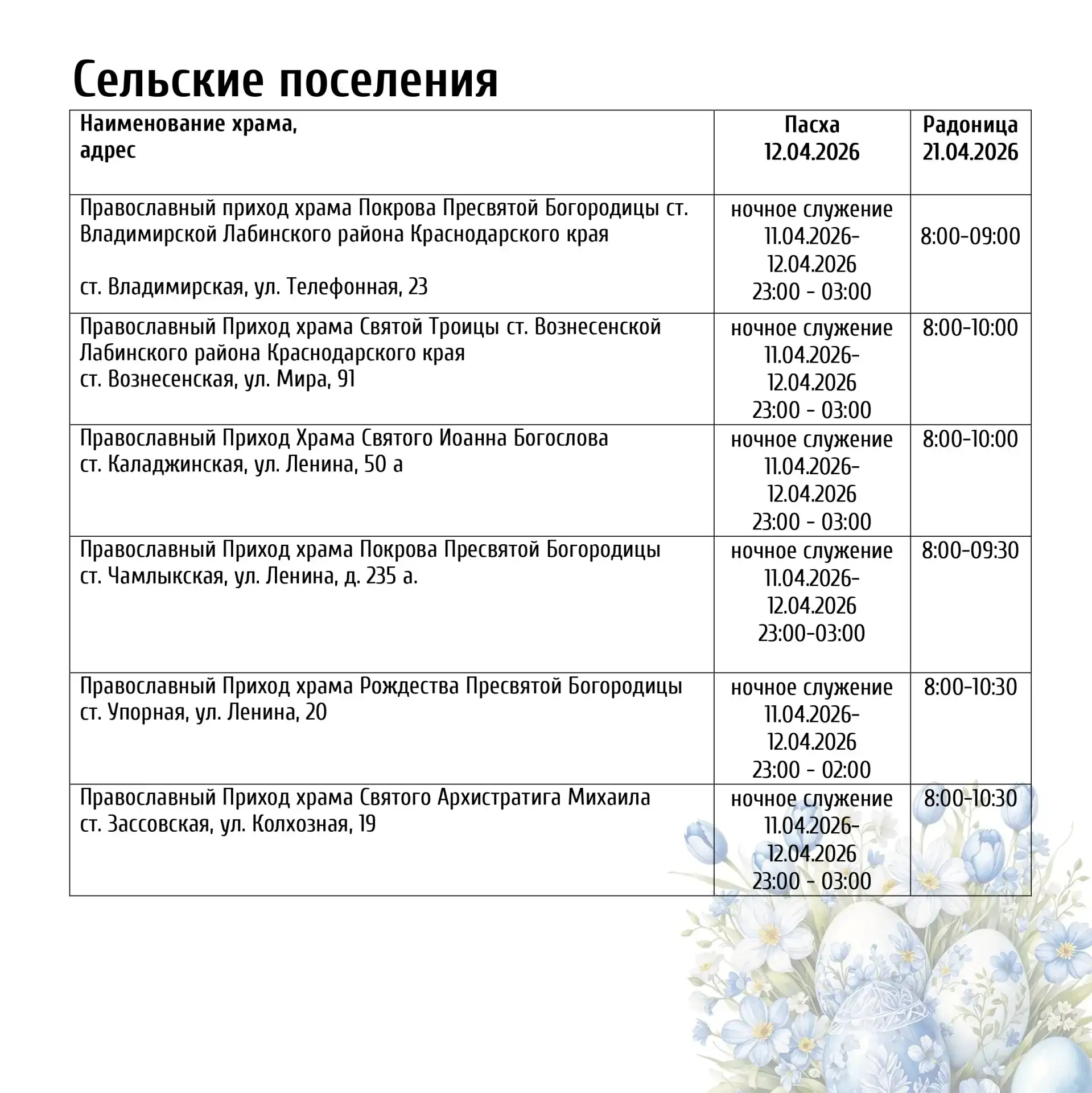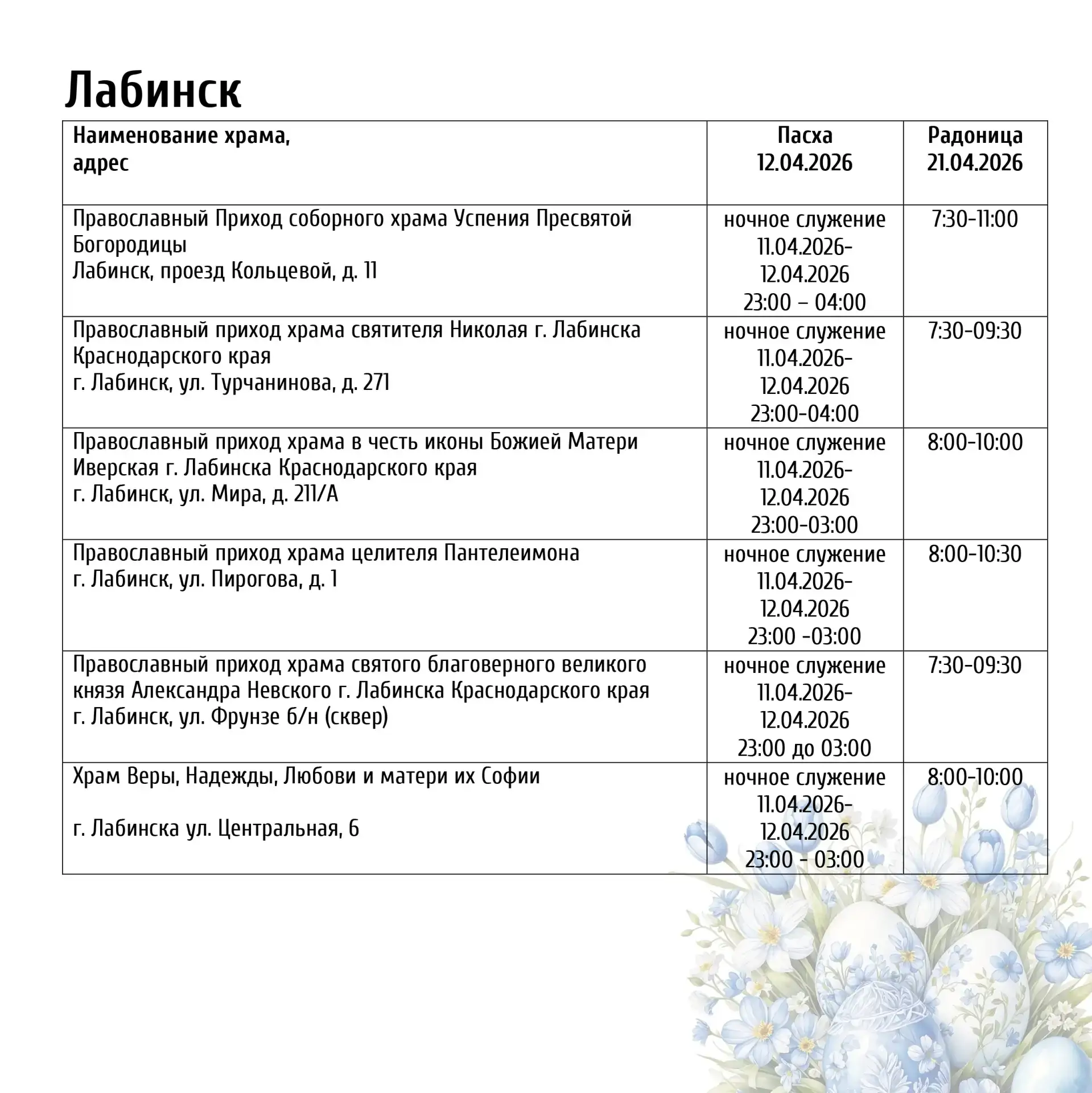 12 апреля мы отметим главный христианский праздник — Светлое Христово Воскресение (Пасху). В прикрепленных карточках вы найдете полное расписание богослужений: информацию о том, где и в какое время пройдут службы, а также освящение пасхальных куличей.