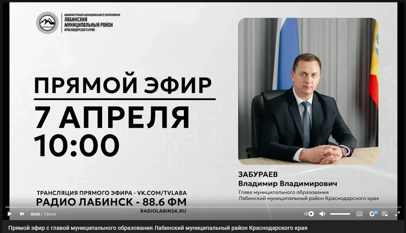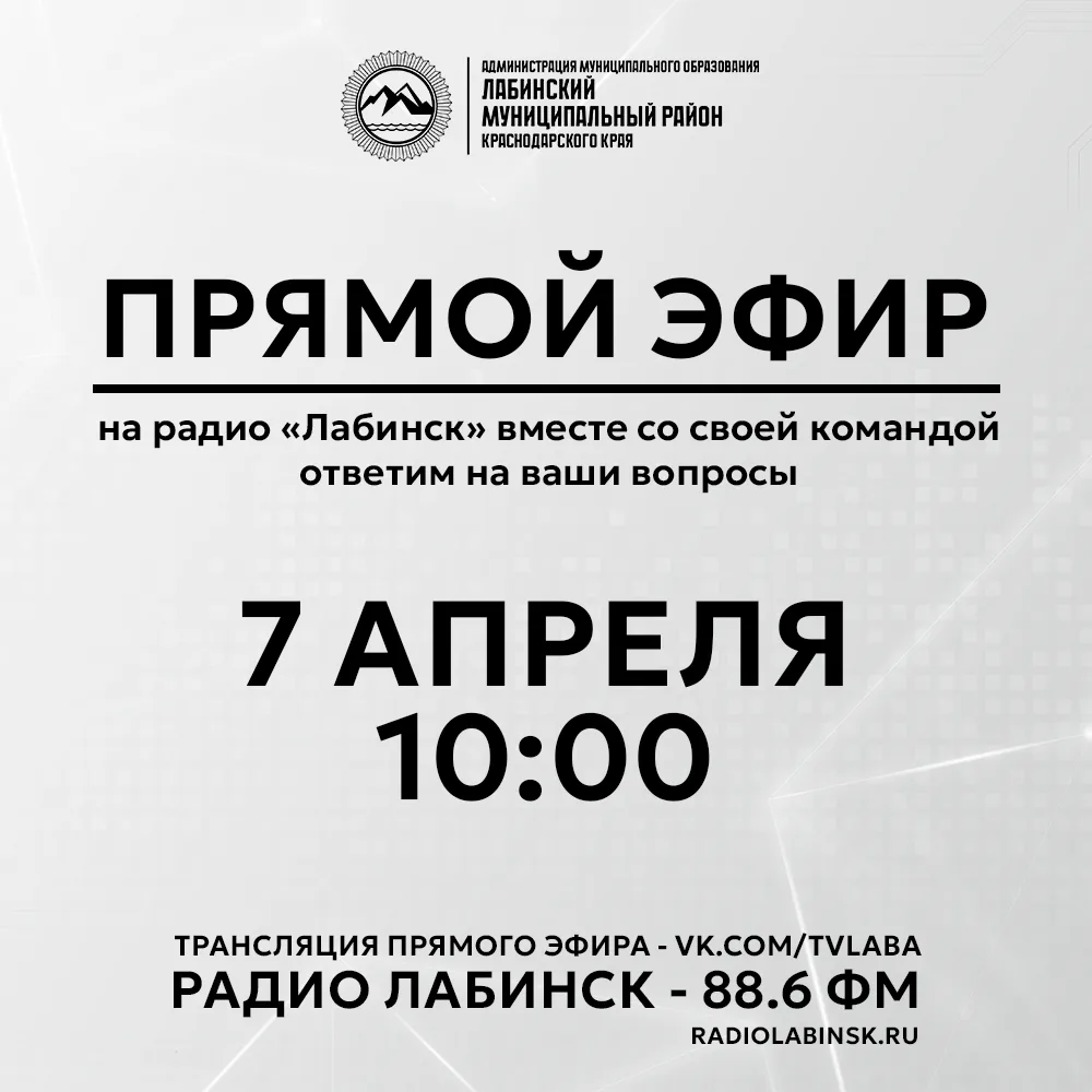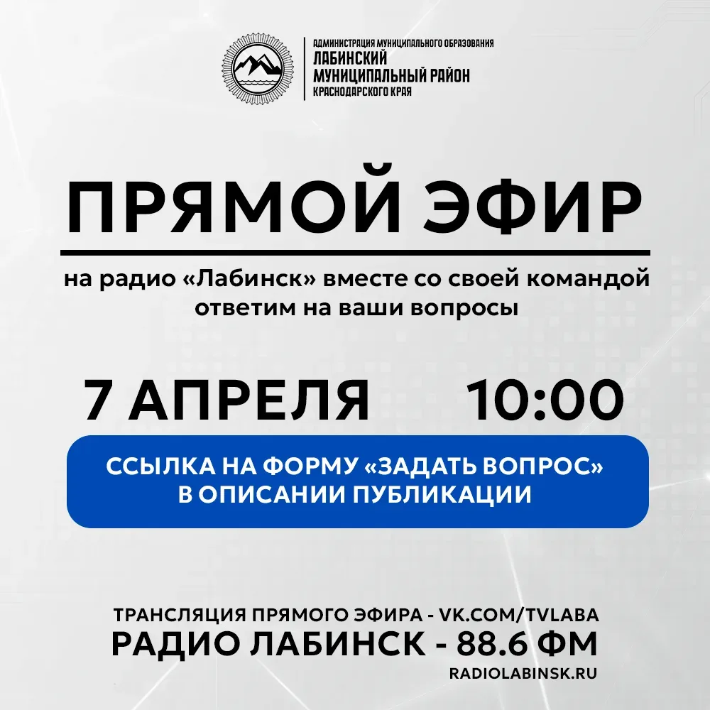 Как я ранее сообщал, во вторник, 7 апреля 2026 года, в 10:00, в прямом эфире на радио «Лабинск» вместе со своей командой ответим на ваши вопросы. Приглашаю всех присоединиться. Вопросы можно задавать заранее и во время эфира на прямой трансляции.