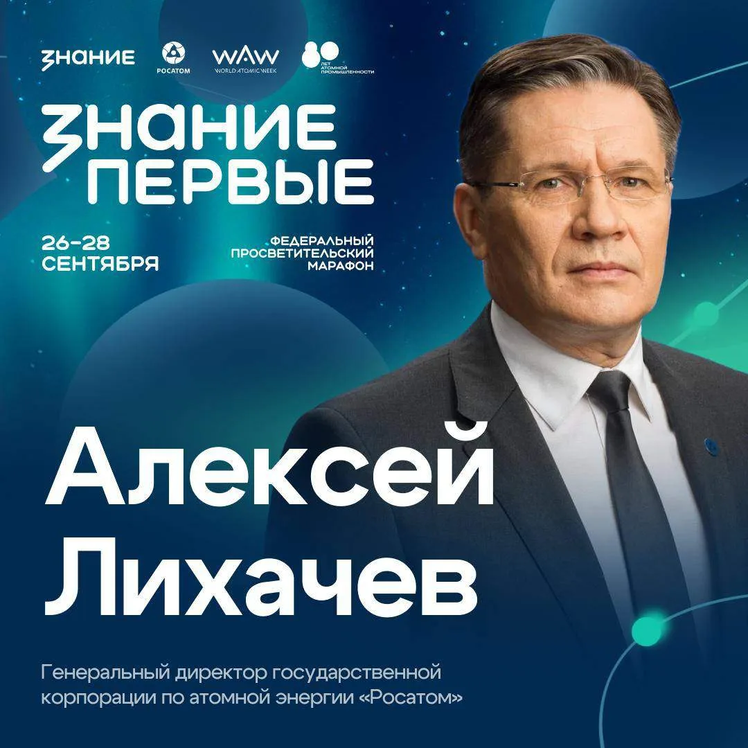⚛️ На главной площадке марафона Знание.Первые на ВДНХ в Москве, посвящённого 80-летию атомной промышленности России, выступит генеральный директор Государственной корпорации по атомной энергии «Росатом» Алексей Лихачёв!