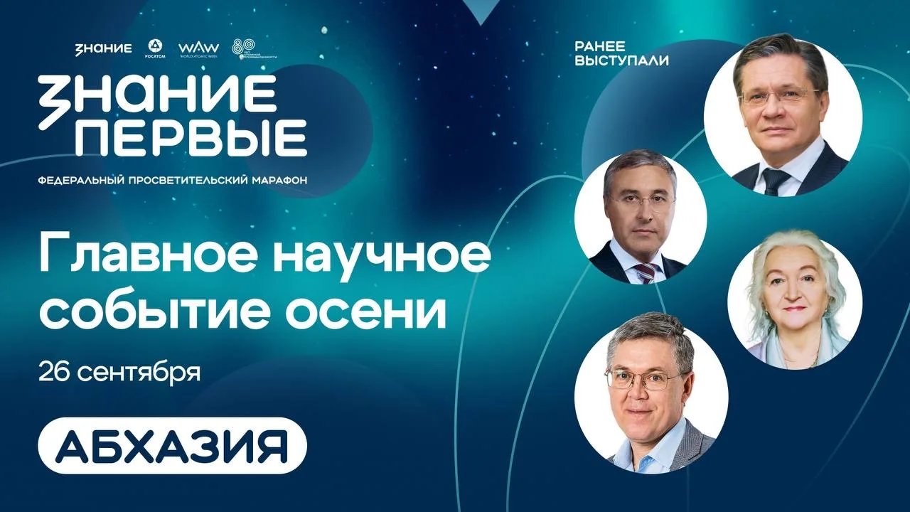 26 сентября в Сухуме впервые пройдёт марафон Знание.Первые, приуроченный к 80-летию атомной промышленности России. Организатор — Общество «Знание» при поддержке ГК «Росатом».