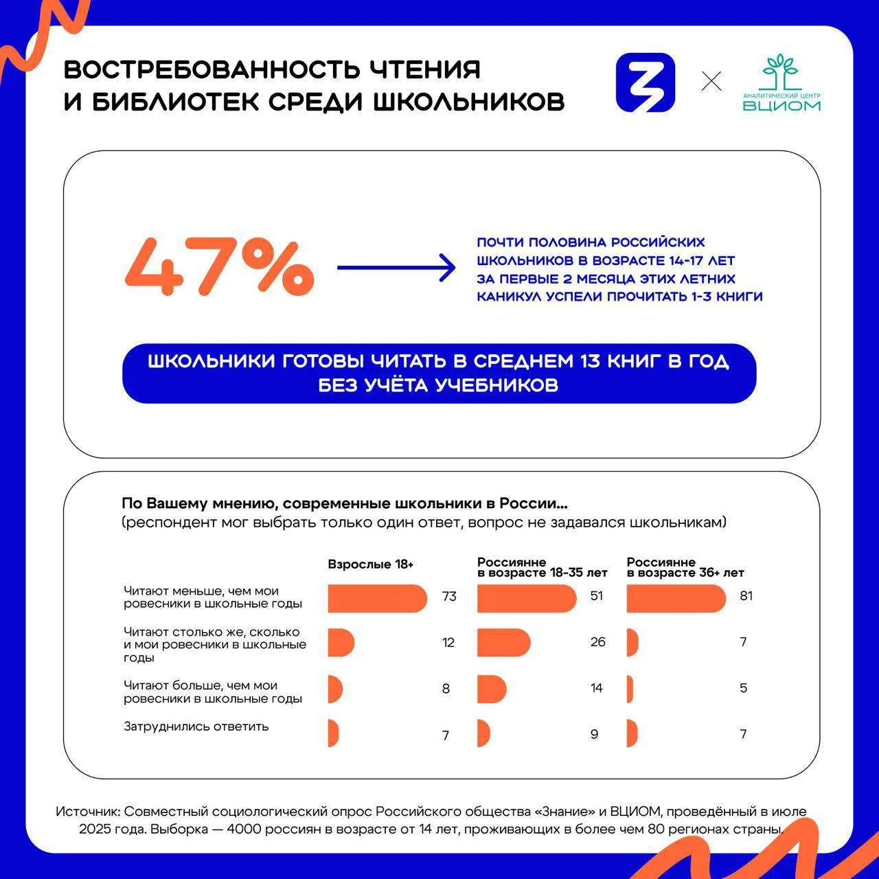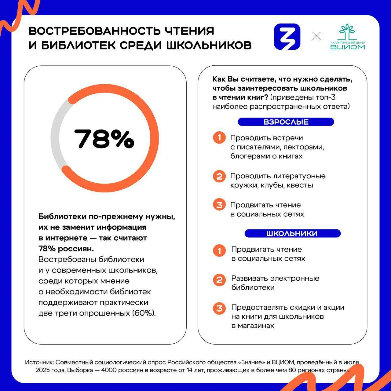 📚В преддверии нового учебного года Российское общество «Знание» совместно с ВЦИОМ провело масштабное исследование о чтении и библиотеках, в котором приняли участие 4000 россиян старше 14 лет из более чем 80 регионов страны.