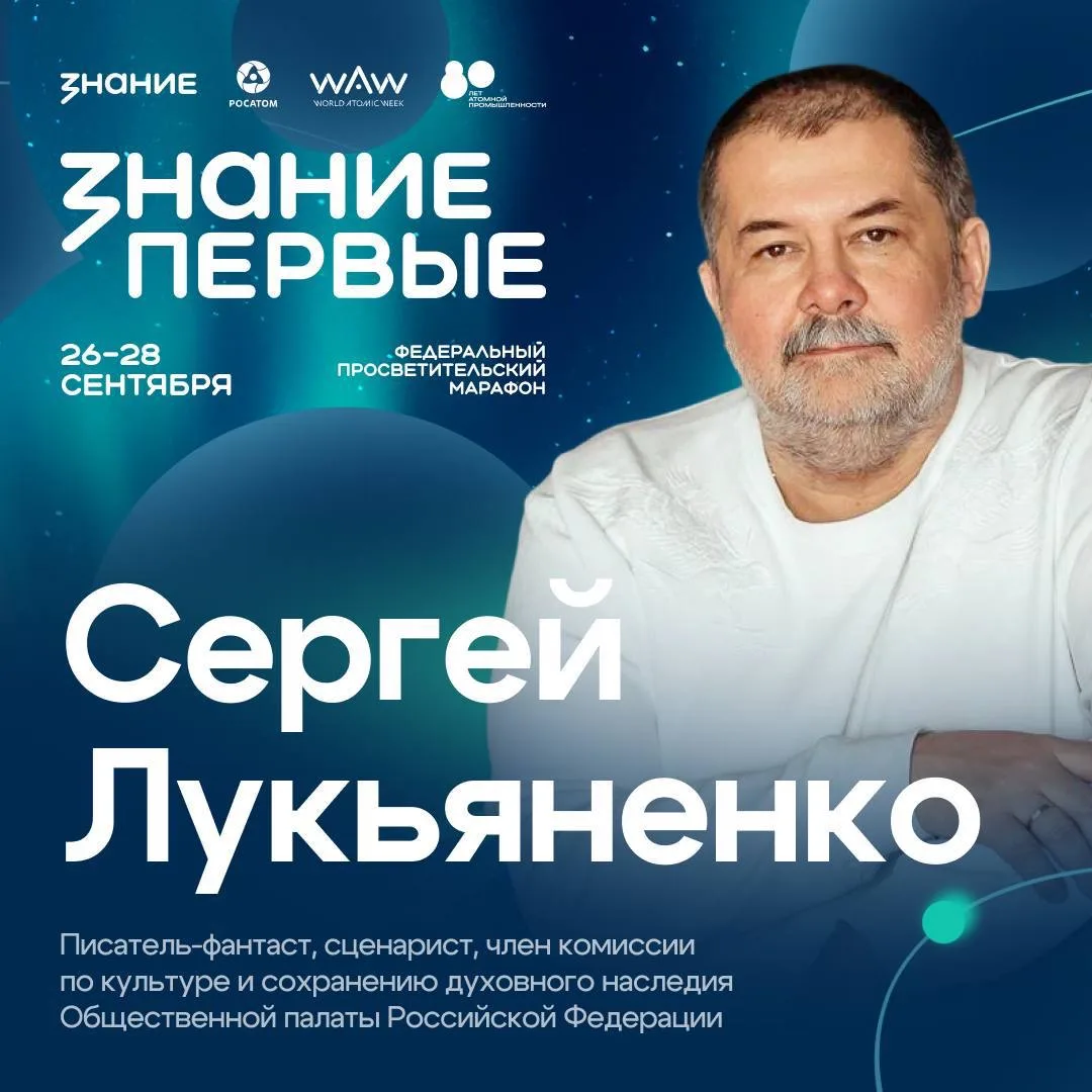 ⚛️ На главной площадке марафона Знание.Первые на ВДНХ в Москве, посвящённого 80-летию атомной промышленности России, выступит писатель-фантаст, сценарист, член комиссии по культуре и сохранению духовного наследия Общественной палаты Российской Федерации Сергей Лукьяненко!