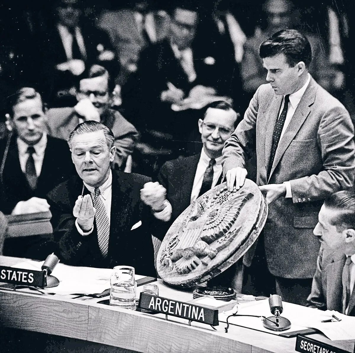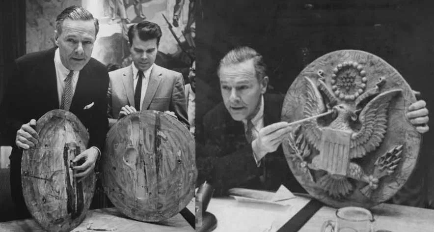 В 1945 году советские школьники преподнесли в подарок американскому послу изящное деревянное панно, украшенное гербом США и выполненное из ценных пород дерева.