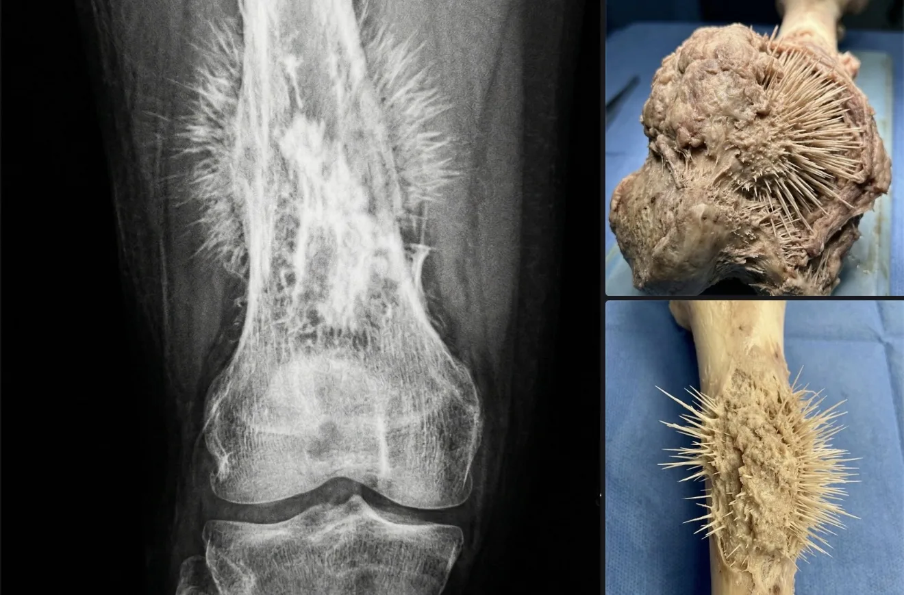 Остеосаркома - это агрессивный рак костной ткани. Один из самых тревожных признаков на таких изображениях - так называемые спикулы, или игольчатый периостоз. На снимке кость будто покрывается острыми лучами, и выглядит это так, словно организм уже не просто болеет, а буквально кричит о беде.