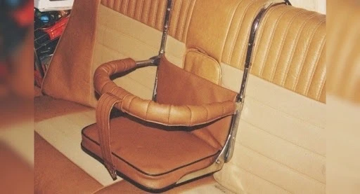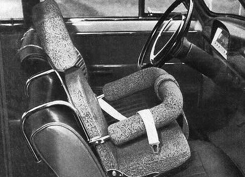 Прообраз современного автокресла представлял собой простой металлический каркас, поверх него - поролон, обтянутый тканью. Крепить конструкцию предлагалось на спинке сидений при помощи двух свободно вращающихся трубок и ремня безопасности.