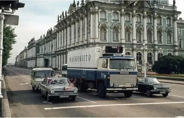 Состоятельный кортеж: две «Волги», серая, украшенная для свадьбы, и номенклатурная чёрная. Также польский автомобиль «Nysa-522» и фургон «Scania» из Финляндии стоят на светофоре у Зимнего дворца. Ленинград, 1980е гг.