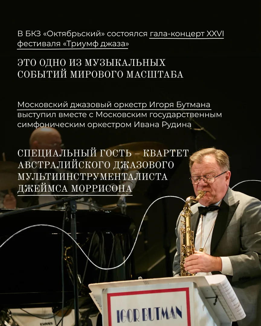 3. Приняли XXVI фестиваль «Триумф джаза». Фестиваль мирового уровня был создан легендарным саксофонистом Игорем Бутманом в 2001 году.
