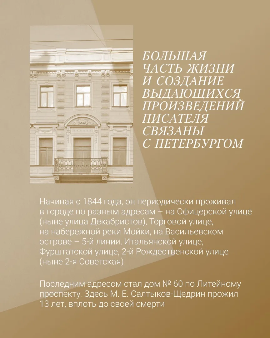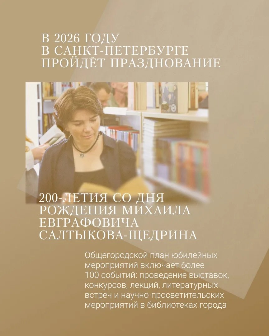 К юбилею в Петербурге пройдёт более 100 мероприятий: выставки, лекции, театральные постановки, библиотечные проекты. В театрах уже идут спектакли по произведениям Салтыкова-Щедрина, а в Театре Эстрады имени Аркадия Райкина готовится премьера «Повесть о том, как один мужик двух генералов прокормил».