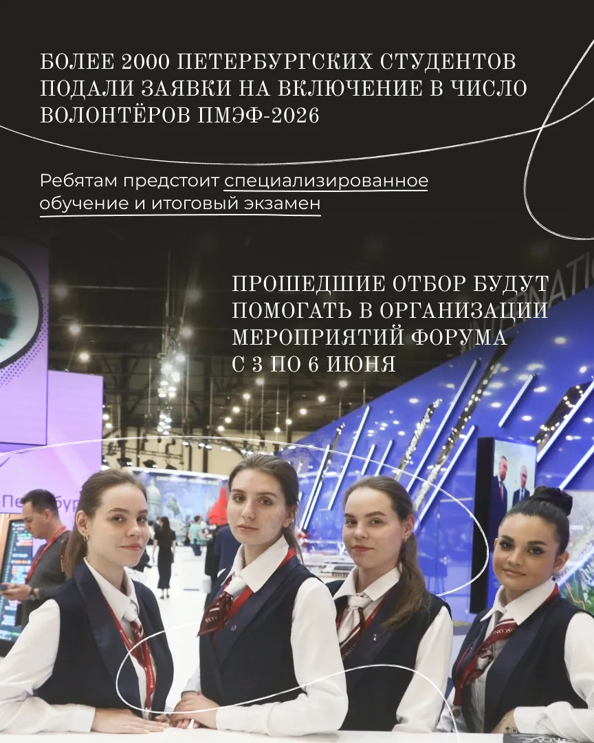 2. Свыше 2000 студентов подали заявки в волонтëрский корпус ПМЭФ-2026. Форум пройдёт в Петербурге с 3 по 6 июня.