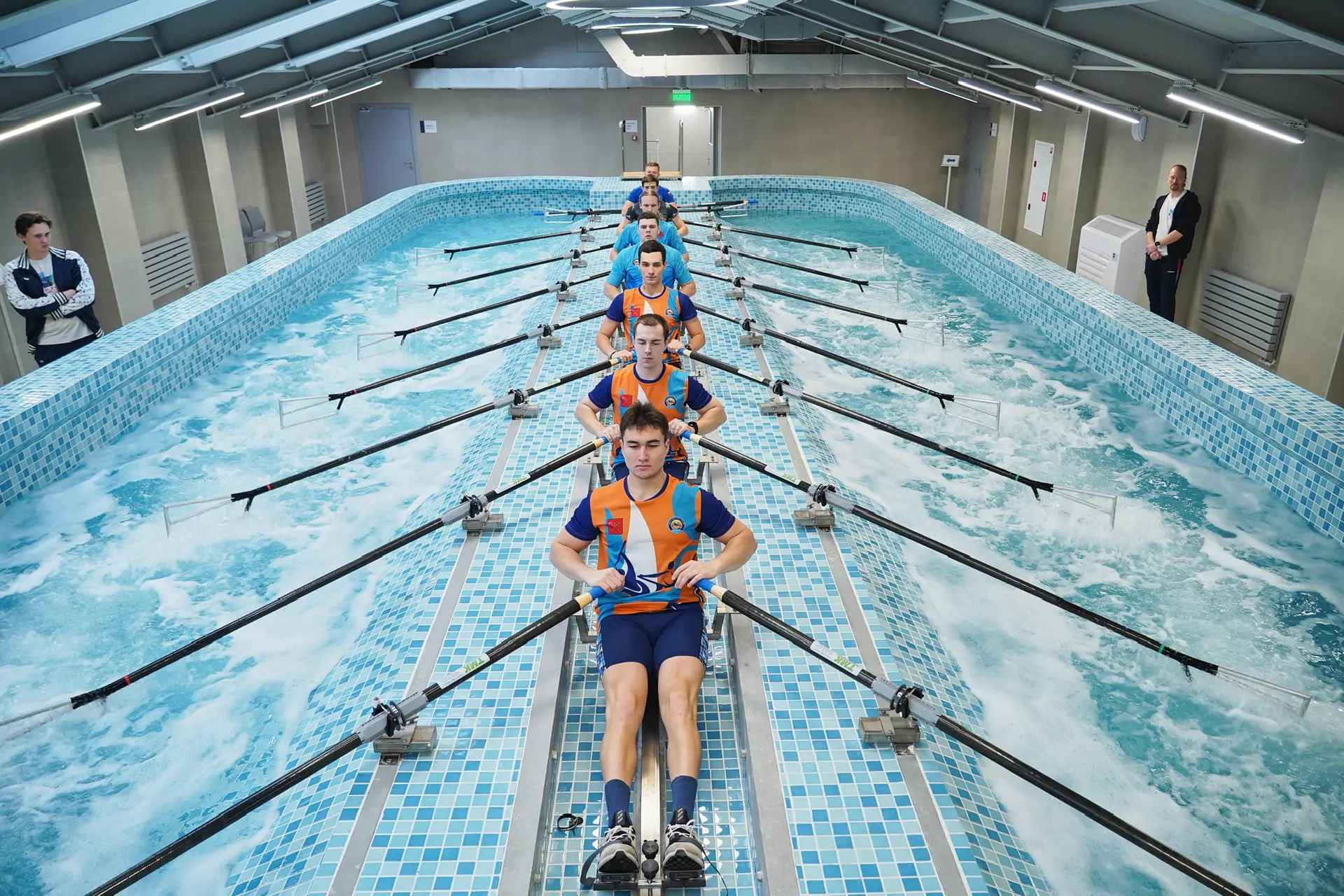 Внутри – плавательный и гребной бассейны, тренажёрные залы, зал для спортивных единоборств, медицинский кабинет.