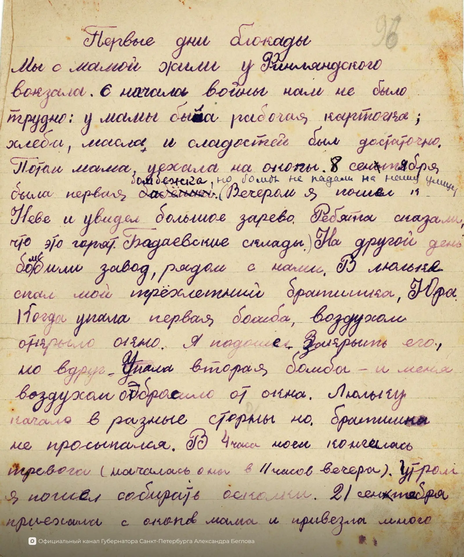 «Диктор сообщил, что блокада Ленинграда полностью снята… Я подбежала к бабушке, посадила её за стол, взяла кусок бумаги, нарисовала город Ленинград, изображённый точкой, потом нарисовала круг – этим я изобразила кольцо немцев, и разъяснила всё это бабушке. Затем зачеркнула кольцо и оставила только «город», и сказала: «Вот и всё, блокады больше нет». Бабушка заплакала от радости…», – из школьного сочинения ученицы 4‑го класса Иткиной Зинаиды.