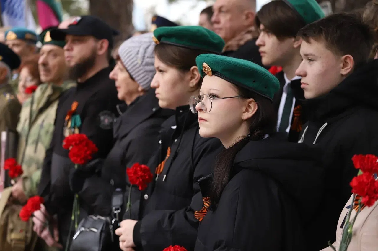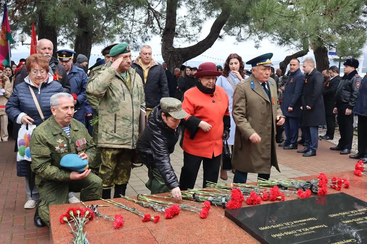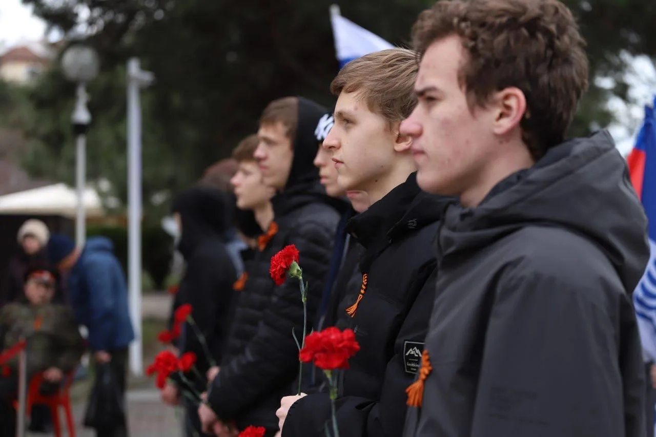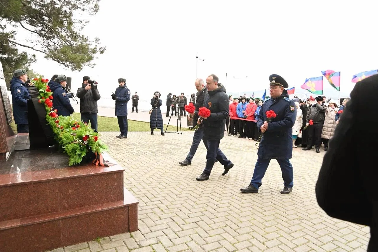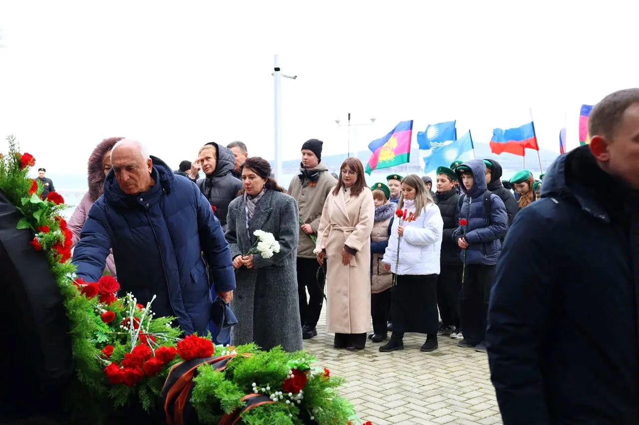 Вместе с участниками специальной военной операции, активом города, представителями национальных общин почтили память героев у памятника Морякам-Куниковцам на Толстом Мысе.