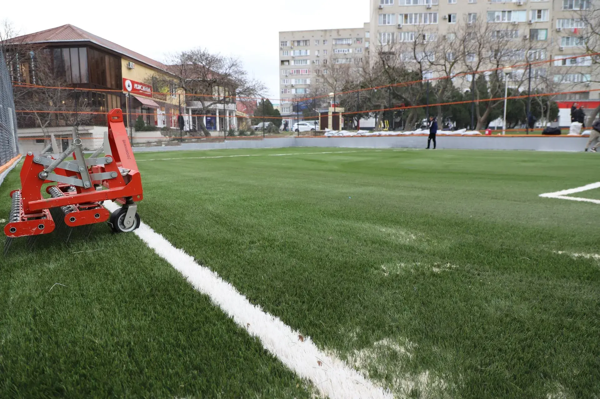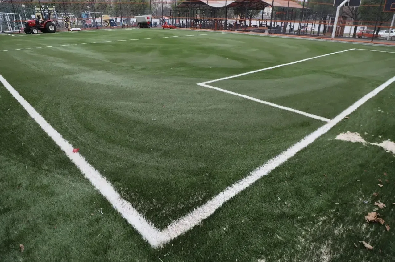 Сейчас подрядчик на важном этапе: засыпает поле кварцевым песком и резиновой крошкой. Это необходимо, чтобы обработать ворс для долговечной эксплуатации.