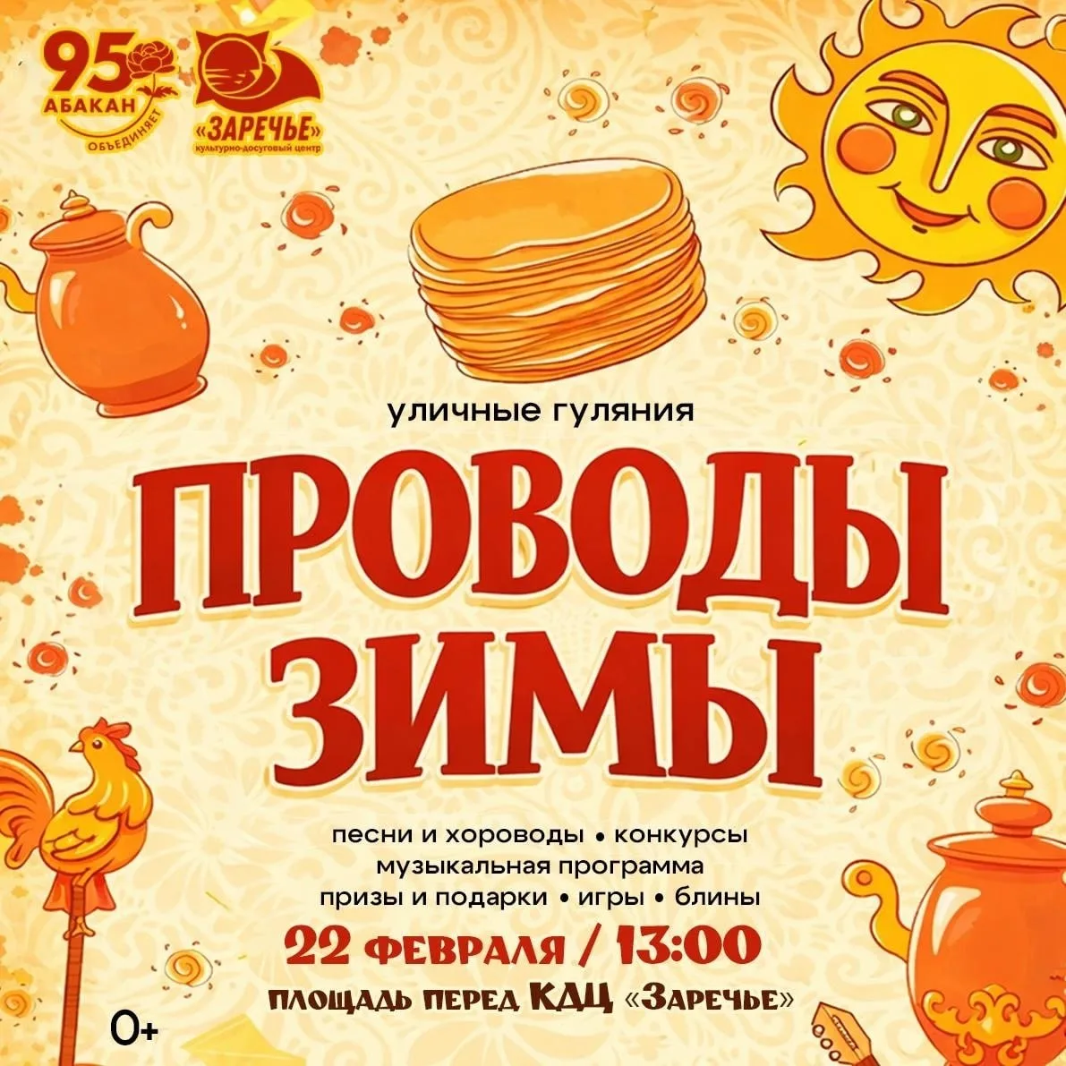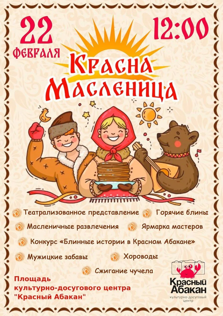 🕛В 12.00 на площади у КДЦ «Красный Абакан» горожан ждёт театрализованное представление, игры, ярмарка мастеров, конкурс на самые вкусные и необычные блинчики, мужицкие забавы, а в финале — сжигание чучела Масленицы.