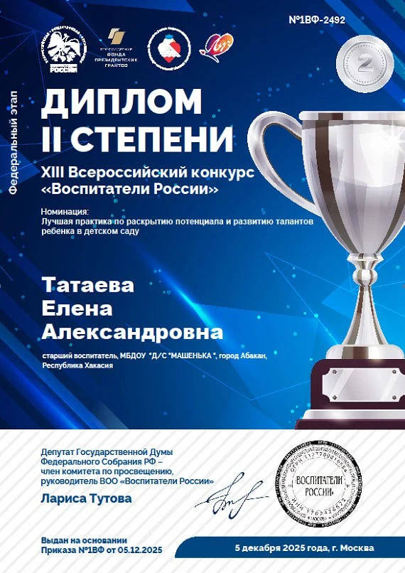 👏🏻Воспитатель абаканского детского сада «Машенька» Елена Татаева стала лауреатом XIII Всероссийского конкурса «Воспитатели России»