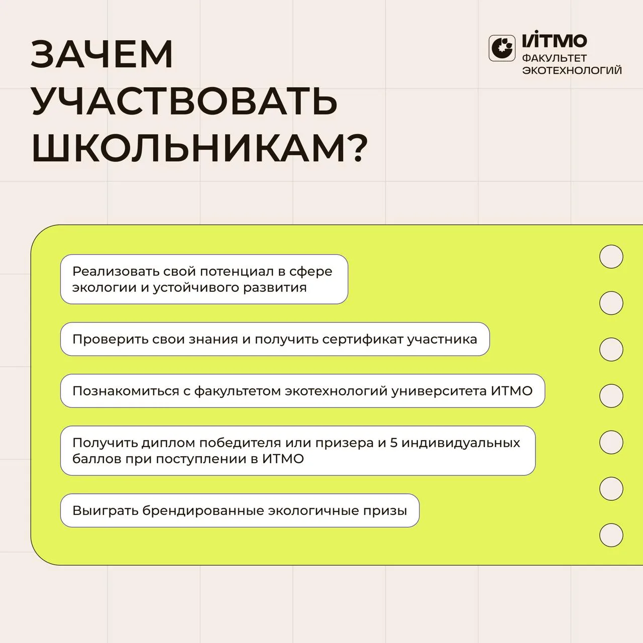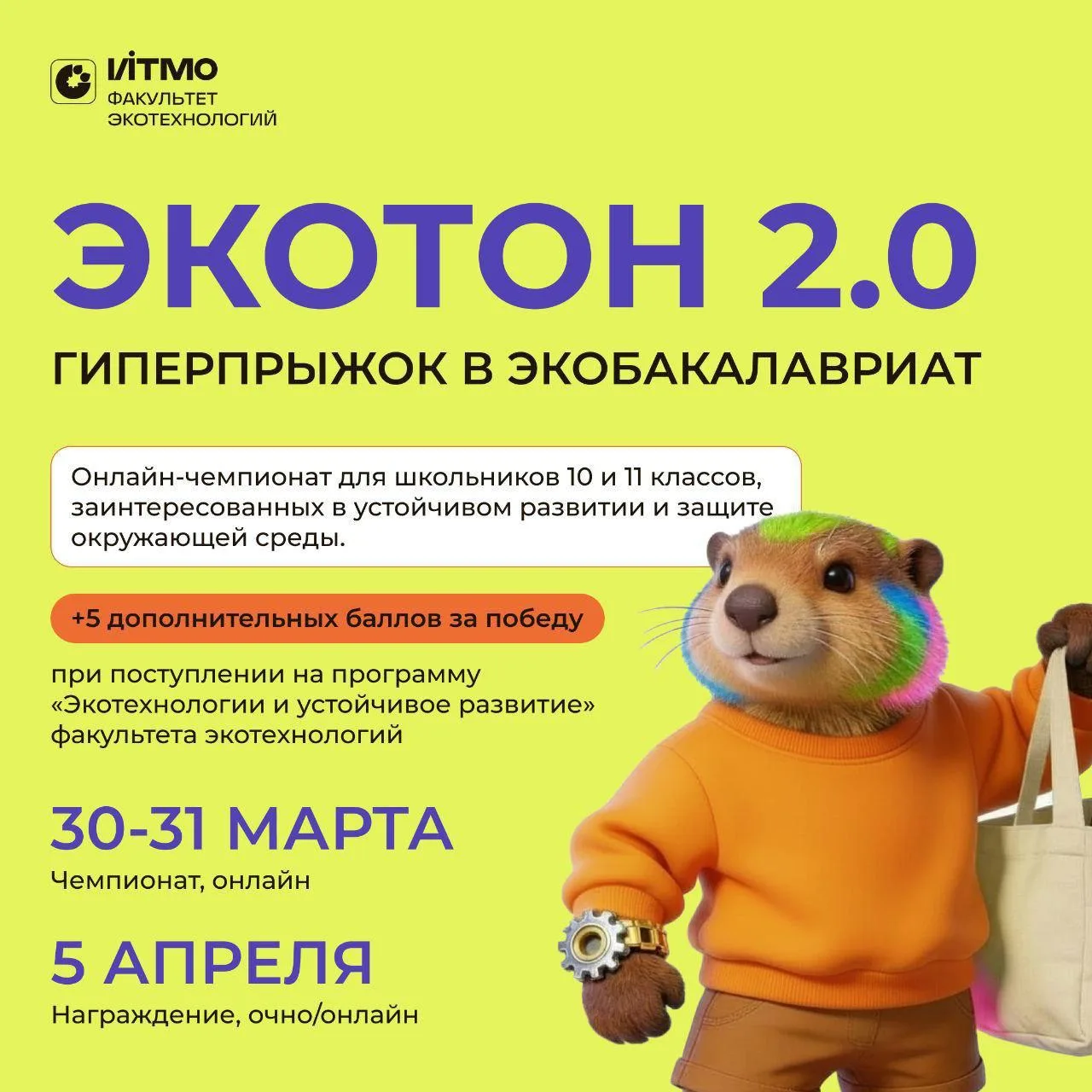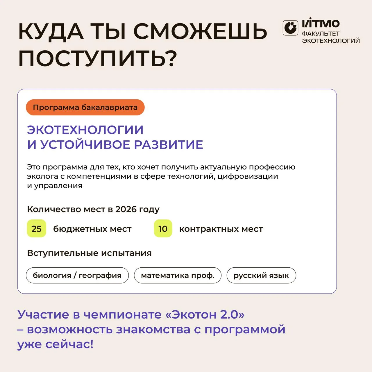 Экотон — проект факультета Экотехнологий ИТМО, который помогает школьникам прокачать свой потенциал в области экологии и устойчивого развития и получить дополнительные баллы при поступлении.