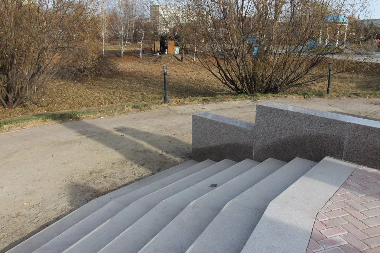 Первый этап работ завершен. Заменили лицовку монумента, которая пришла в негодность, заменили на саяногорский гранит, а ступени сделали из нескользящего термообработанного гранита.