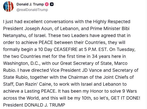 «Эти два лидера договорились, что для достижения мира между их странами они официально начнут 10-дневное перемирие в 17:00 по восточному времени. Я поручил вице-президенту Вэнсу и госсекретарю Рубио, вместе с председателем Объединенного комитета начальников штабов Дэном Рэзин' Кейном, работать с Израилем и Ливаном для достижения прочного мира», – написал президент США в соцсетях.