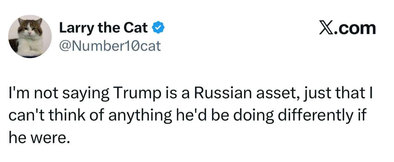 У знаменитого котейки Ларри, который принадлежит премьеру Великобритании, есть своя страничка в соцсетях. В новой публикации мохнатый намекнул, что президент США Дональд Трамп может руководствоваться интересами не только своей страны.