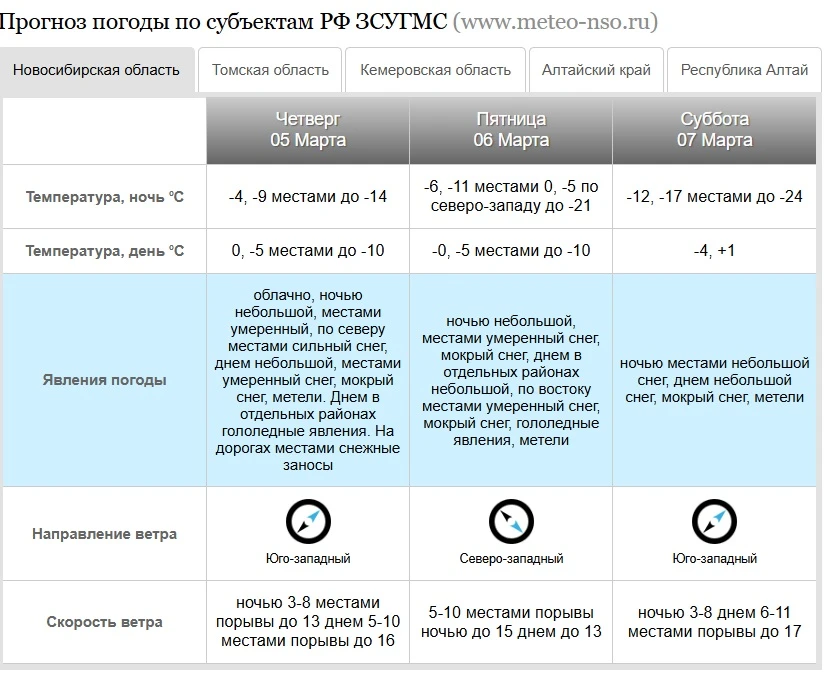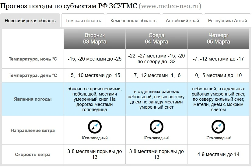 Синоптики «Западно-Сибирского УГМС» прогнозируют постепенное повышение температуры воздуха, гололёд на дорогах и осадки. Ночные заморозки до -32°C сменятся оттепелью до 0°C к четвергу, также в регионе ожидается сильный снегопад с порывистым ветром до 8-13 м/с.