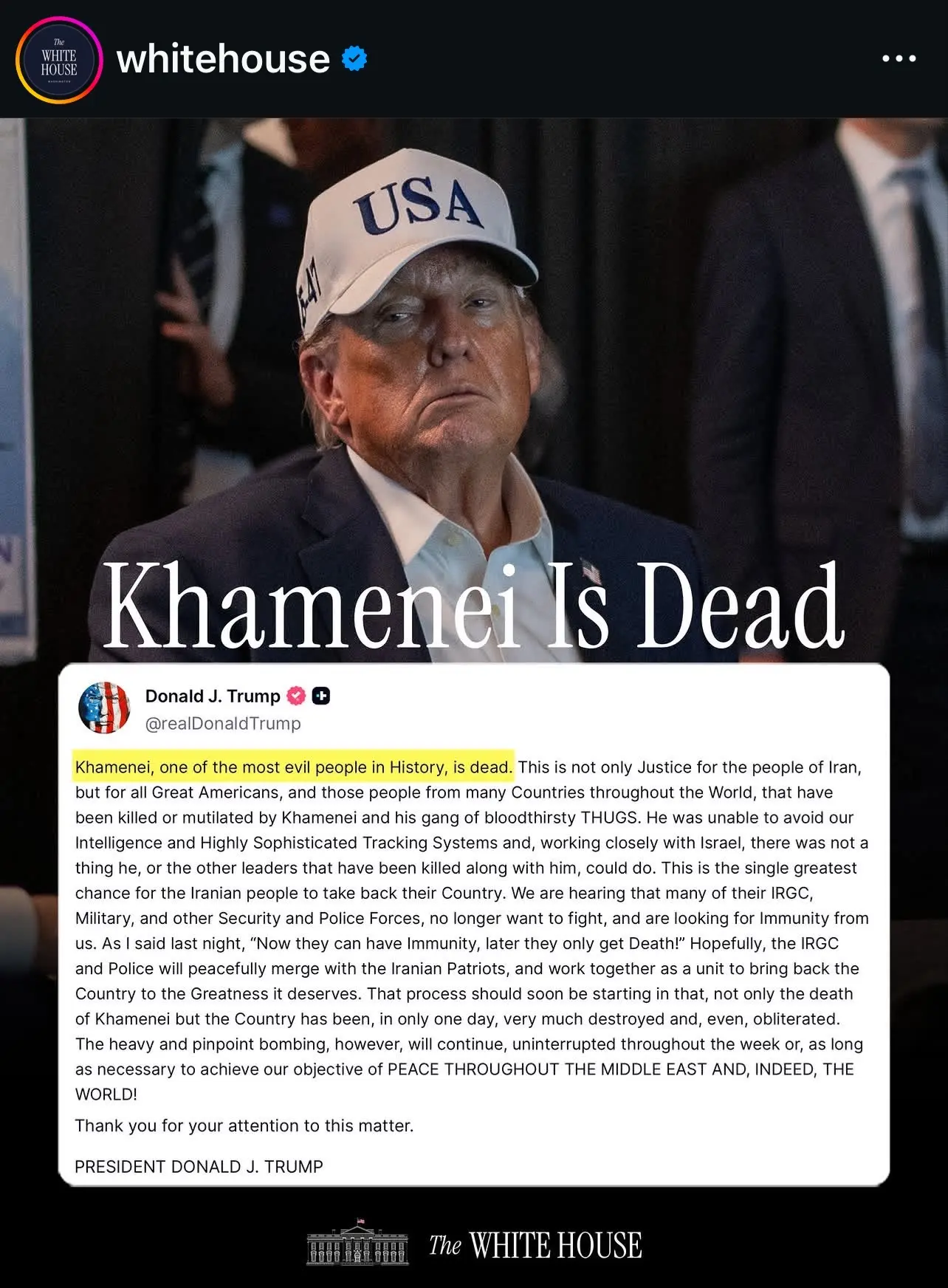 🇺🇸 В аккаунте Белого дома опубликовано заявление Дональда Трампа о том, что лидер Ирана Хаменеи убит ❌