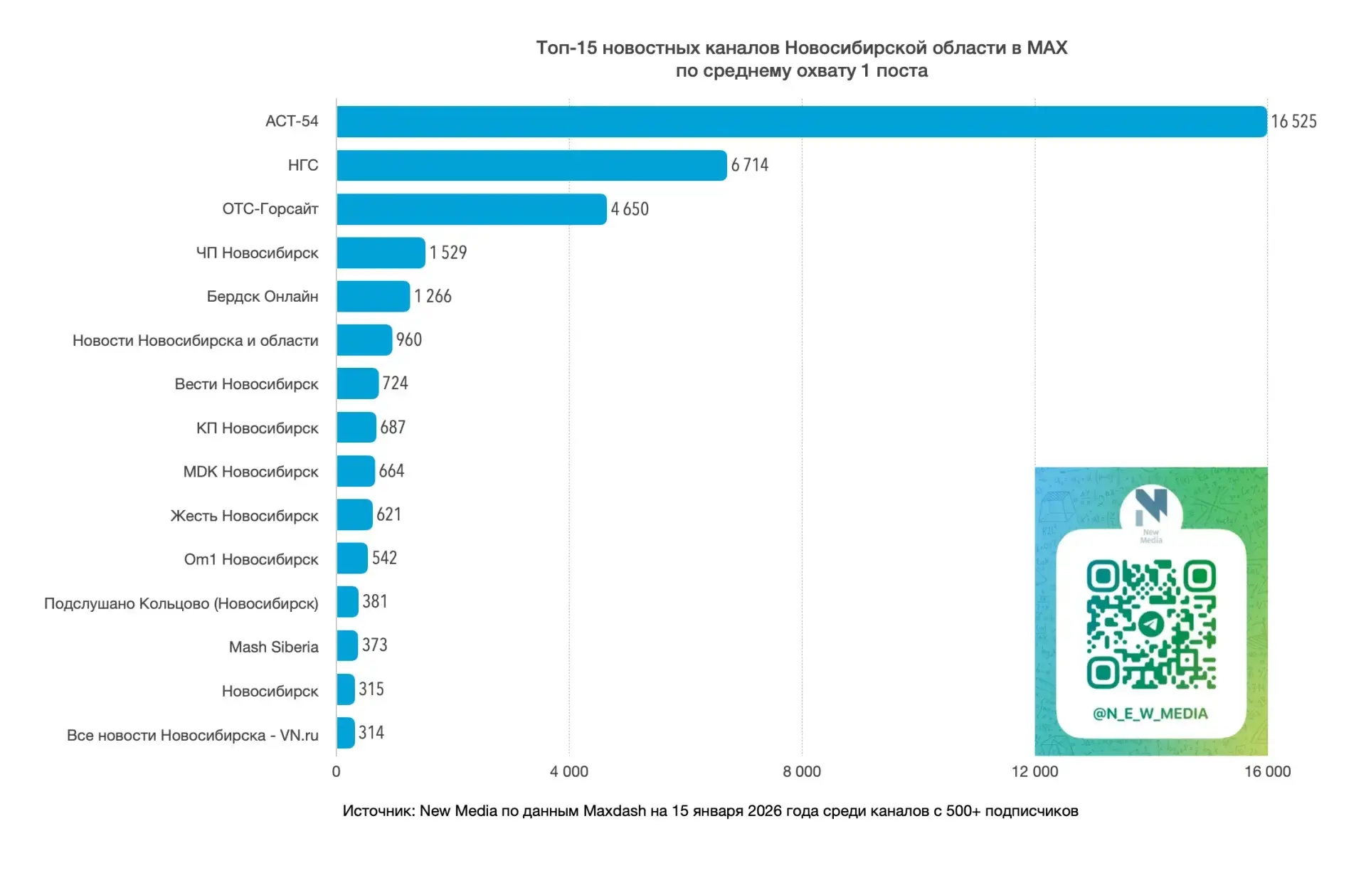 🏆 АСТ-54 занял первое место в МАХ по среднему охвату в рейтинге новостных каналов Новосибирской области по версии экспертов из New Media, которые сегодня опубликовали статистику, основанную на данных Maxdash.