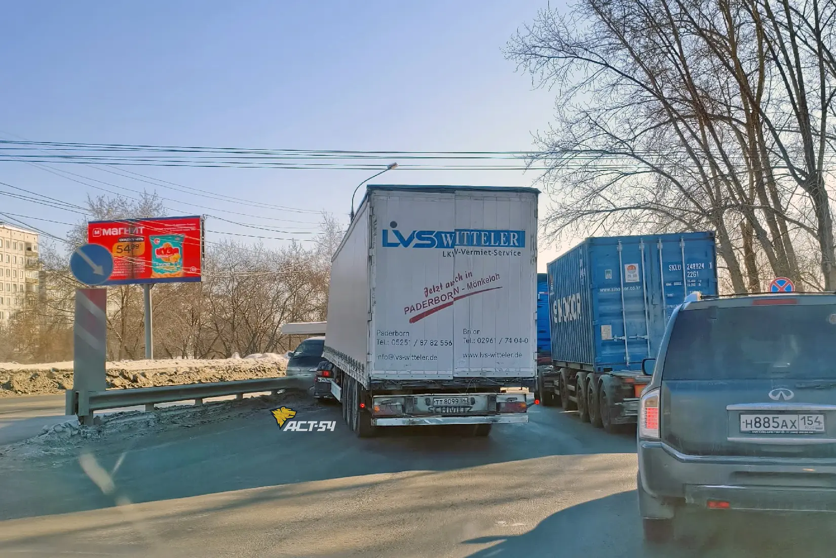🚛 Фура частично съехала с дороги между Новосибирском и Колыванью. Край прицепа нависает над проезжей частью, незначительно мешая другому транспорту.