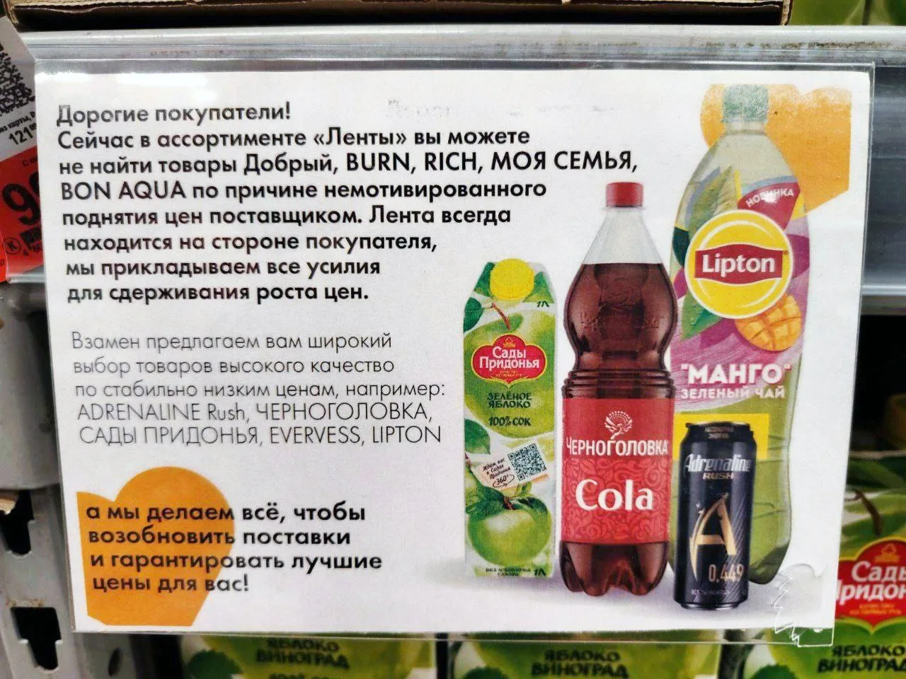 🧃 Популярные напитки «Добрый», «Моя Семья», «Rich», «Burn» и «BonAqua» вывели из ассортимента «Ленты» из-за высоких закупочных цен на продукцию, сообщил ритейлер