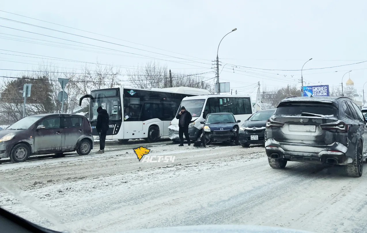 У съезда с Бугринского моста в сторону Меги столкнулись сразу 5 автомобилей, в том числе два маршрутных такси. Информации о наличии в аварии пострадавших пока не поступало.
