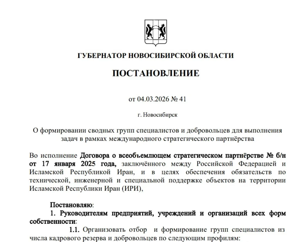 ❌ Фейковые постановления о наборе добровольцев в Иран распространяют по чатам Новосибирска — рассылка ведётся якобы от имени министра сельского хозяйства региона.
