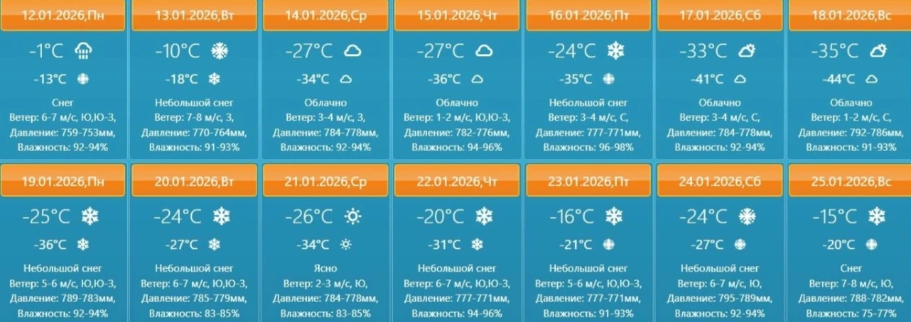 В субботу, 17 января, сервис прогнозирует ночной мороз в -41°C, а в воскресенье до -44°C.