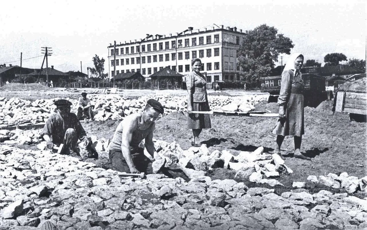 На этой территории до 1940-х гг. находилась оживленная торговая площадь, в народе прозванная «Пупыревской» (в советское время — «площадь Труда»). Вдали — здание, ныне занимаемой школой №14 (Труда ул., д. 67А), было построено в конце 1930-х годов. Самый известный выпускник школы — Александр Серебров (1944 – 2013) — лётчик-космонавт, Герой Советского Союза, кандидат технических наук.