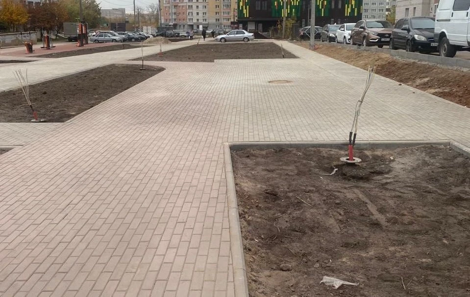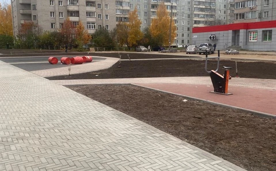 Подрядчик уже обустроил тротуары и частично нанес резиновое покрытие в игровых зонах, также проложены коммуникации для освещения и выполнены мероприятия по отсыпке зелёных зон грунтом. Сейчас ведутся работы по сборке и установке малых архитектурных форм. Все работы планируют завершить в ноябре.