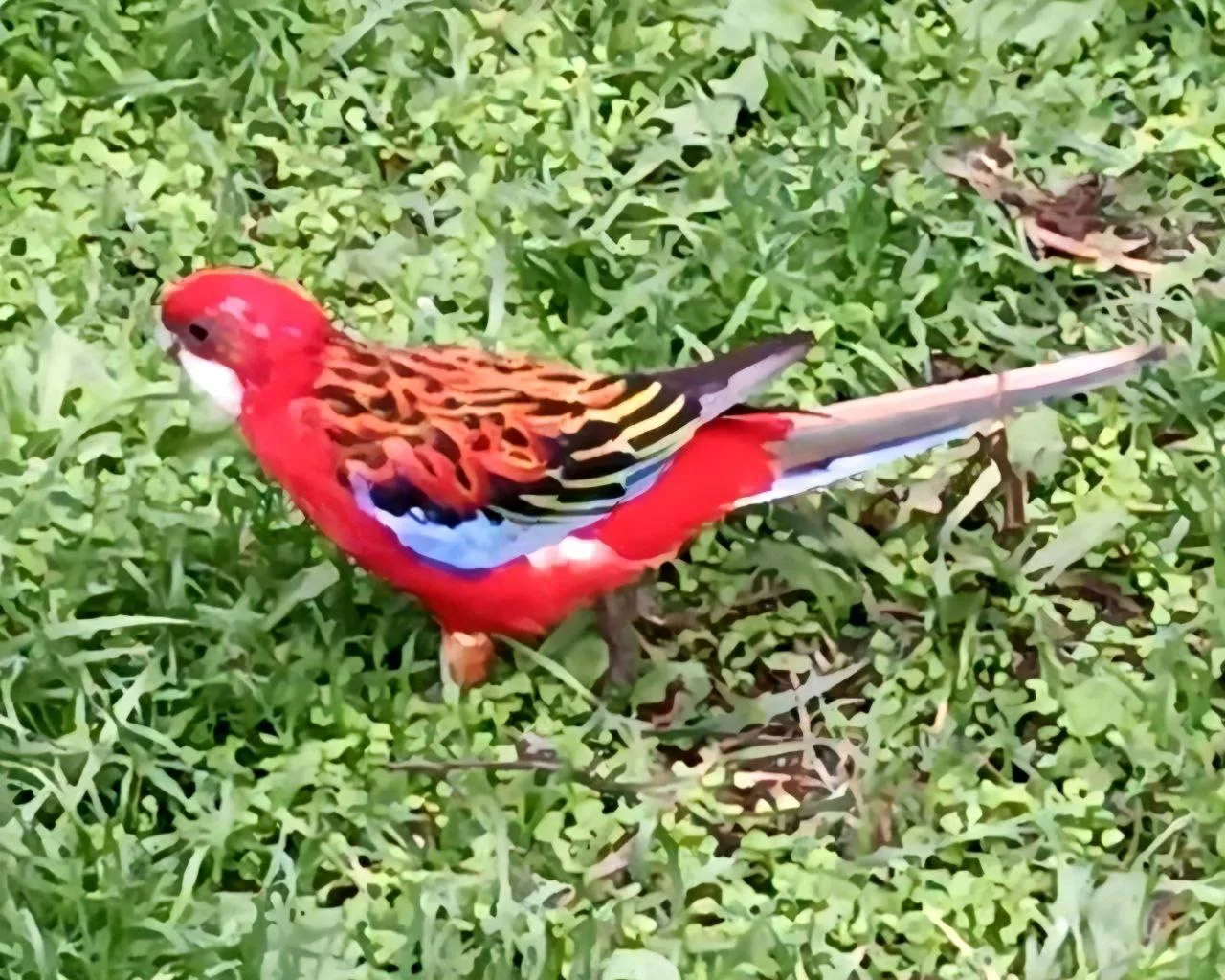 Вот такой красный попугайчик разгуливал по полянке, между общежитием, вблизи мед-института и Гагаринским парком. Позволял к себе подойти, но в руки не давался.