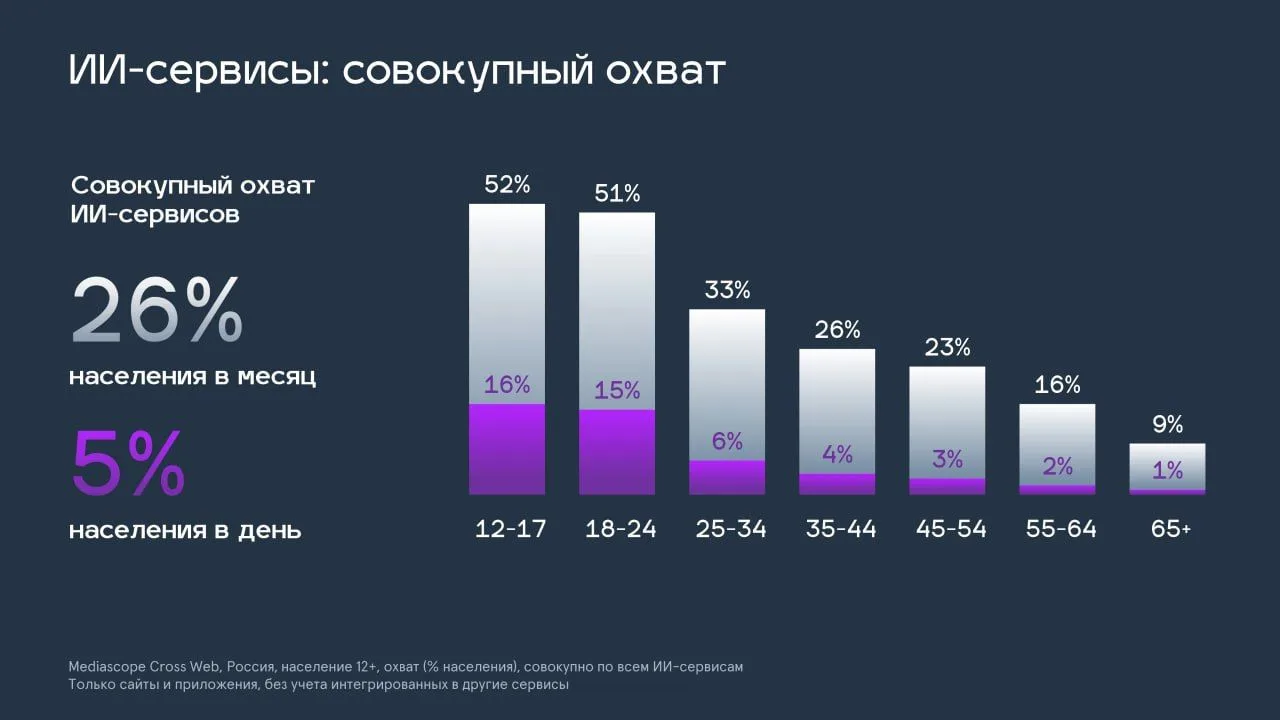 Хотя бы раз в сутки нейросетями пользуются 5% населения. Большей популярностью ИИ пользуется среди аудитории молодежи. В возрастной группе от 12 до 17 лет его используют 52% населения, причем 16% обращаются к ИИ-сервисам ежедневно. Среди аудитории 18–24 лет месячный охват составляет 51%, а ежедневный — 15%.
