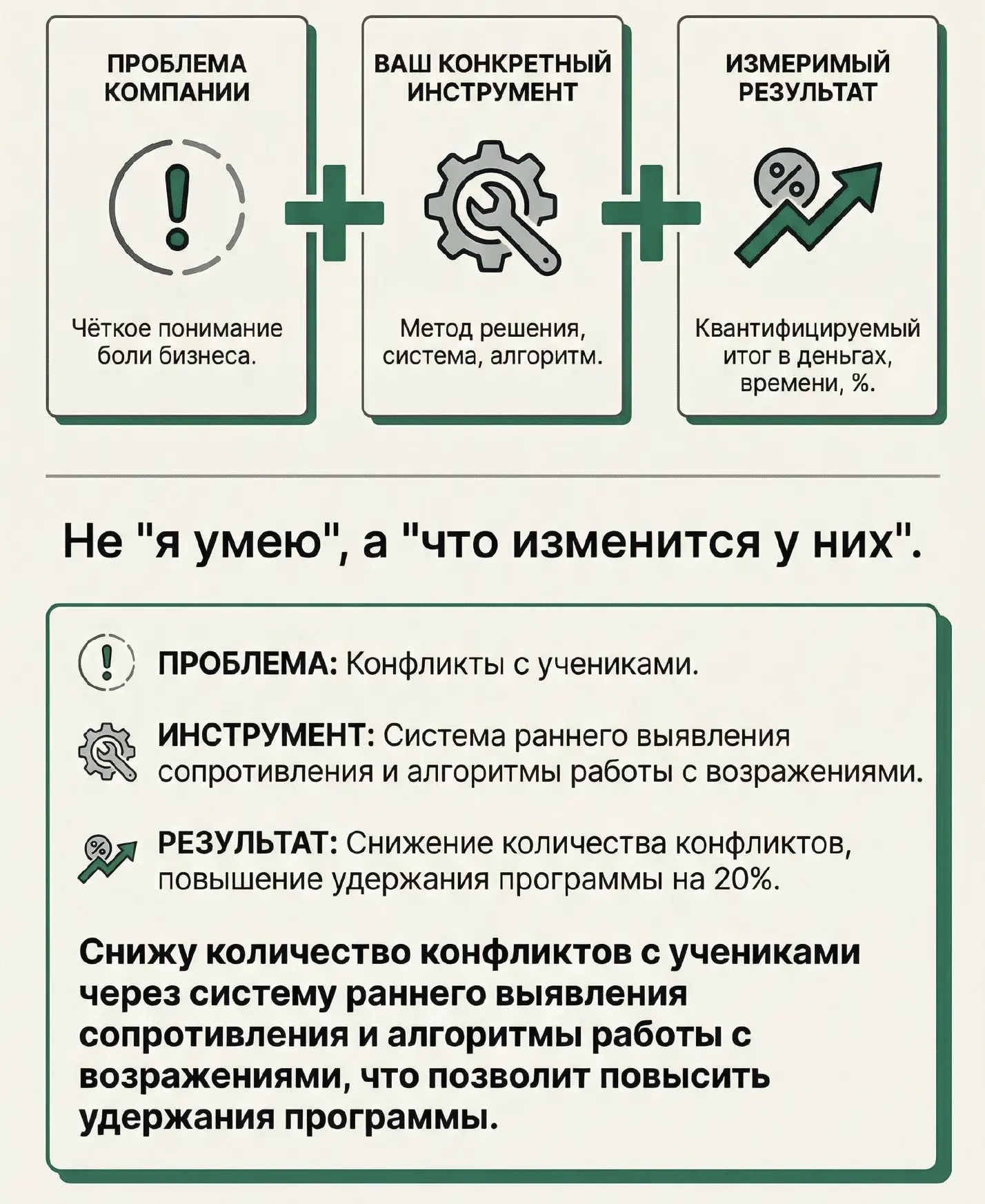 «Помогу снизить конфликтные ситуации с учениками через систему раннего выявления сопротивления, алгоритмы работы с возражениями и регулярную обратную связь».